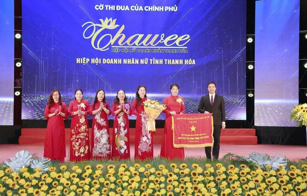 Thừa ủy quyền Thủ tướng Chính phủ, đồng chí Nguyễn Hồng Phong, Phó Bí thư Thường trực Tỉnh ủy trao Cờ thi đua của Chính phủ cho Hiệp hội Doanh nhân nữ tỉnh Thanh Hóa.