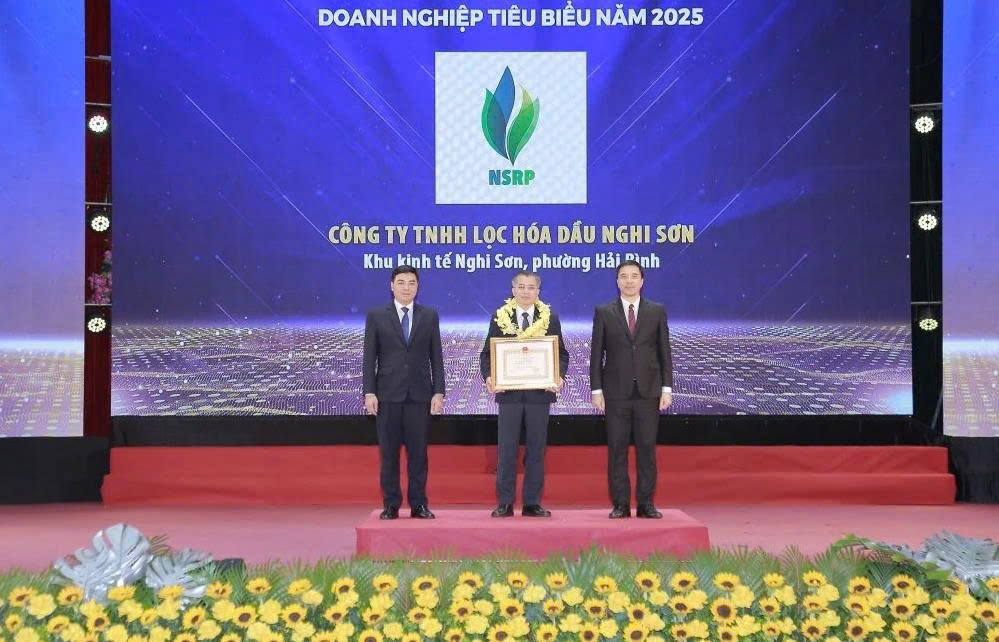 Chủ tịch UBND tỉnh Nguyễn Hoài Anh và Phó Bí thư Thường trực Tỉnh ủy Nguyễn Hồng Phong trao Bằng khen cho Công ty TNHH Lọc hóa dầu Nghi Sơn.