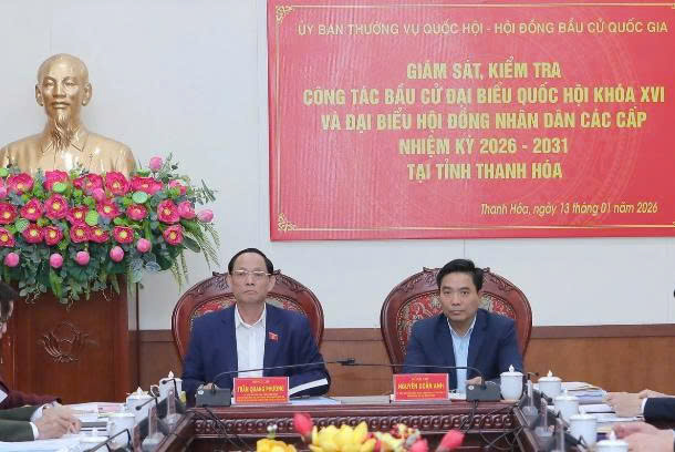 Chiều 13/1, Đoàn giám sát, kiểm tra của Ủy ban Thường vụ Quốc hội - Hội đồng Bầu cử Quốc gia đã làm việc với tỉnh Thanh Hóa để giám sát kiểm tra công tác bầu cử đại biểu Quốc hội khóa XVI và đại biểu HĐND các cấp, nhiệm kỳ 2026-2031.